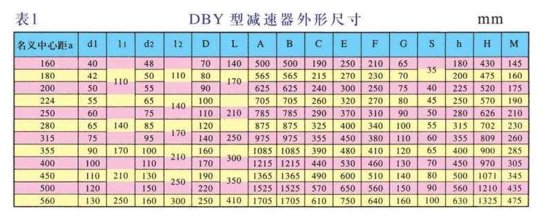 DBY、DBYK、DBZ型減速機(jī)各有12種規(guī)格,名義中心距為:160,180,200,224,250,280,315,355,400,450,500,560mm每種規(guī)格均有5種傳動(dòng)比(8,10,11.2,12.5,14)兩種旋向,四種裝配型式,分別組成240種減速機(jī)。